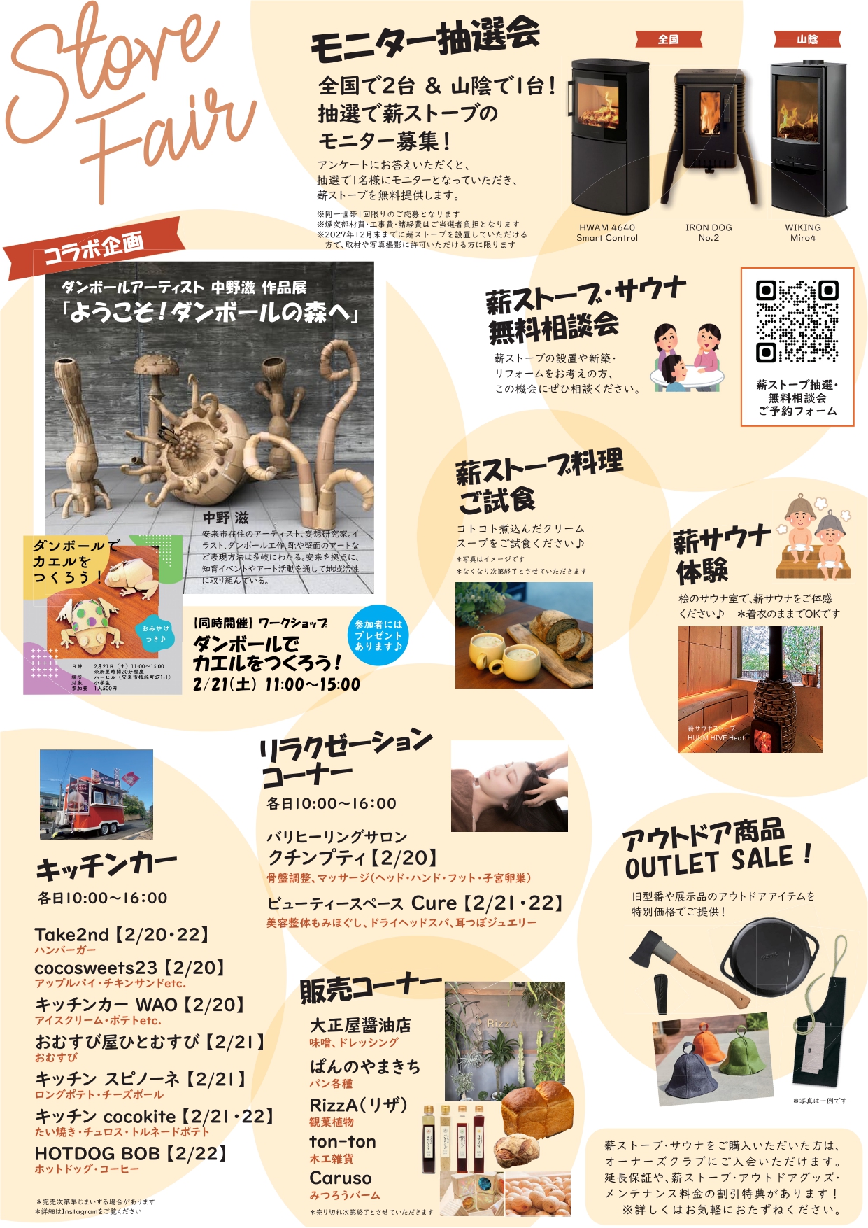 薪ストーブ料理の試食(クリームスープ)や販売コーナー・キッチンカーもやって来る!